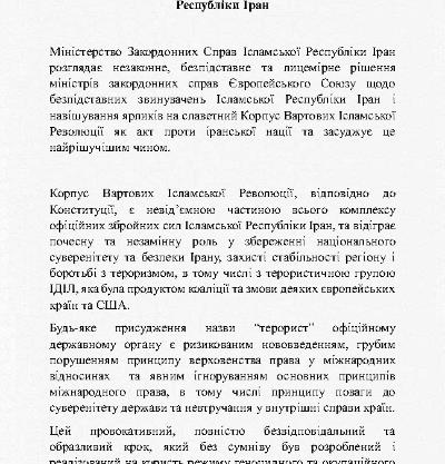 Заява Міністерства закордонних справ Ісламської Республіки Іран щодо військової агресії США проти мирних ядерних об’єктів Ірану